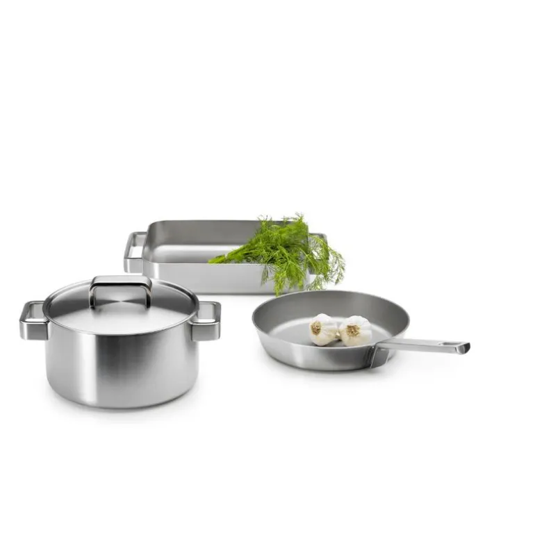 Tools ovnspanne 36x24x6cm. Design Björn Dahlström 1998. Tools er en serie kasseroller og panner i topp design og kvalitet for den kresne og bevisste. Designeren Björn Dahlström har samarbeidet med verdenskjente kjøkkenmestre og materialeksperter for å utvikle funksjonelle og tiltalende kokekar. Kjernen av aluminiumen sørger for at varmen blir raskt fordelt, mens stålet gir jevn temperatur. Tools passer til alle typer ovner; gass, induksjon og vanlig komfyr. Den lille Tools ovnspannen går fra ovnen direkte til bordet med stil. Perfekt for steking av en hel kylling, fisk, grønnsaker og poteter eller til baking. Håndvask anbefales.