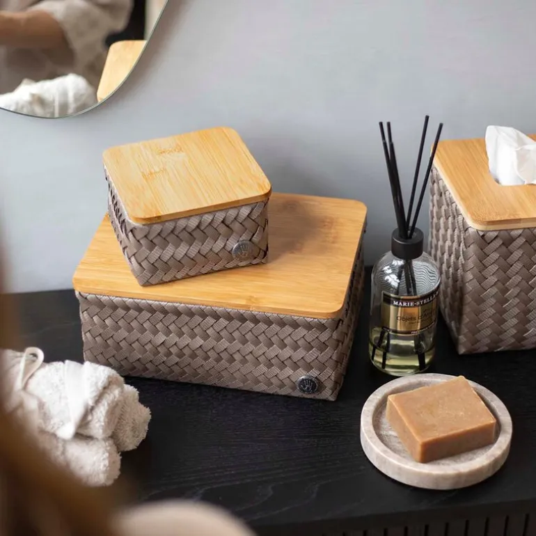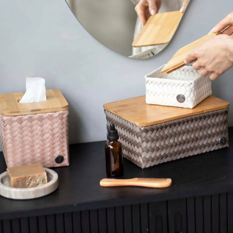 Det solide bambuslokket kombineres med en håndflettet struktur i resirkulert plast som gir varme og tekstur til interiøret. Ideell til servietter, toalettsaker eller småting i stue, kjøkken eller bad.