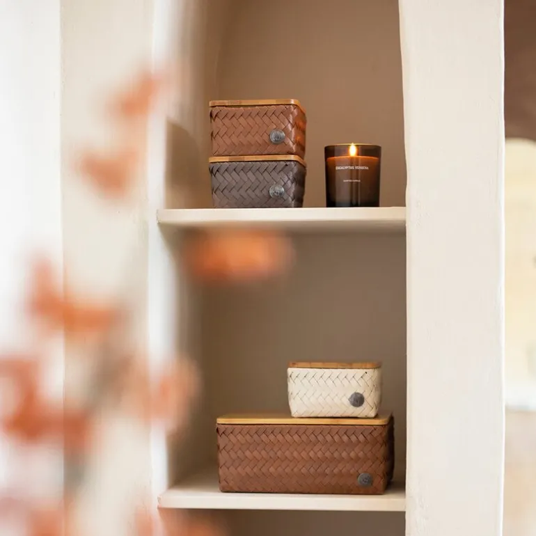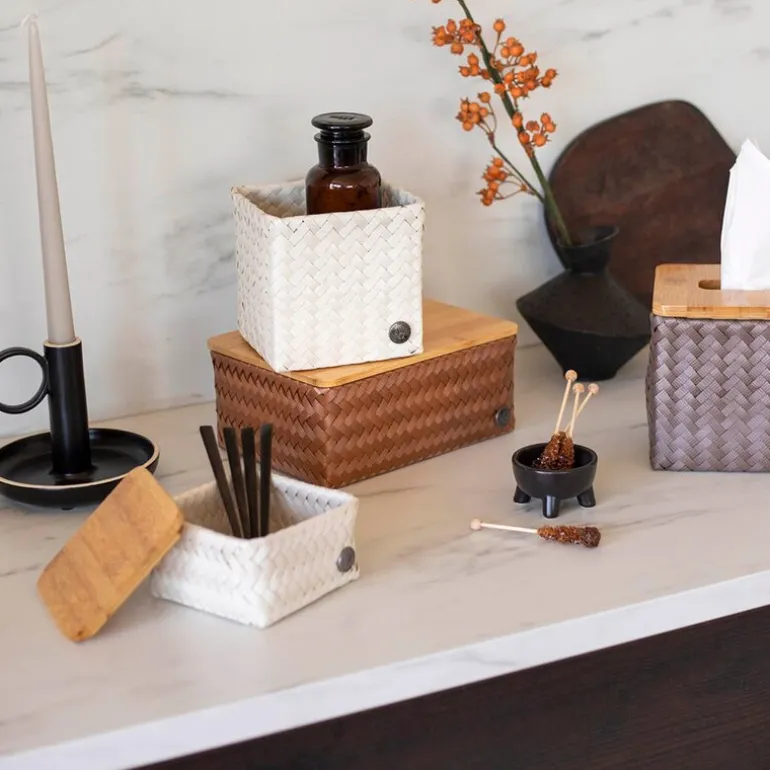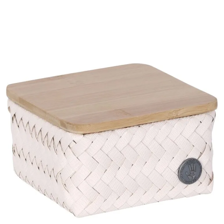 Top Fit Tiny oppbevaringskurv med bambuslokk 13x13x8 cm i champagne fra Handed By er både praktisk og dekorativ. Kurven er en del av TOP FIT-serien, og kan stables i skap, skuffer eller hyller – perfekt til småting du vil ha ryddig.