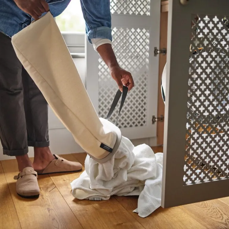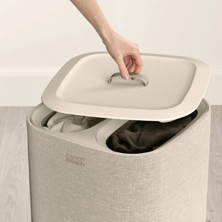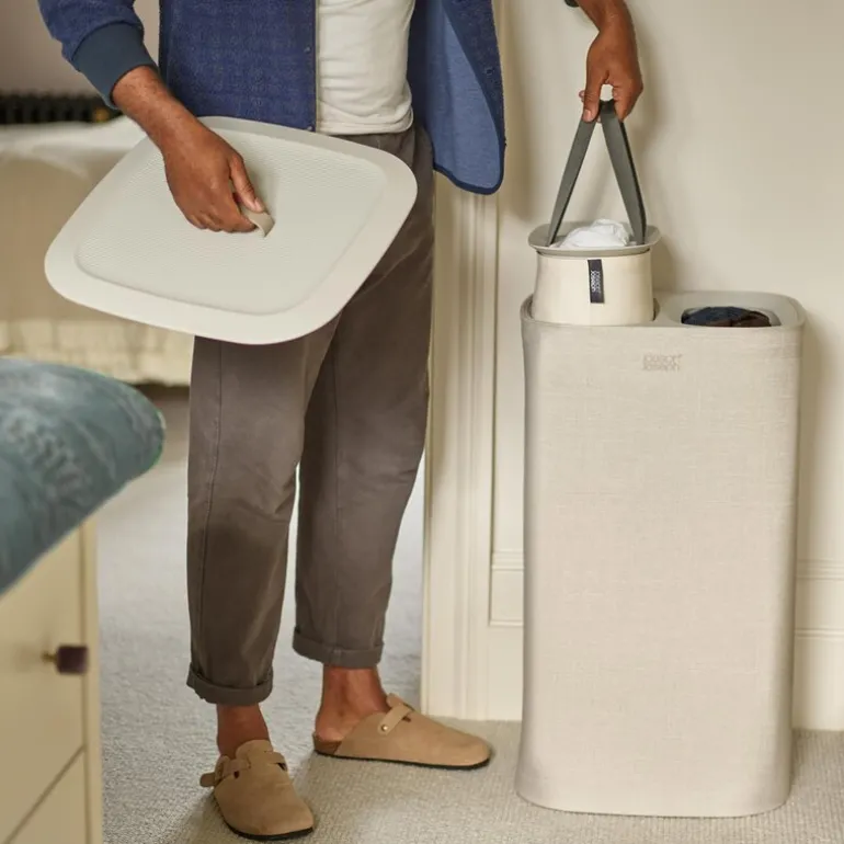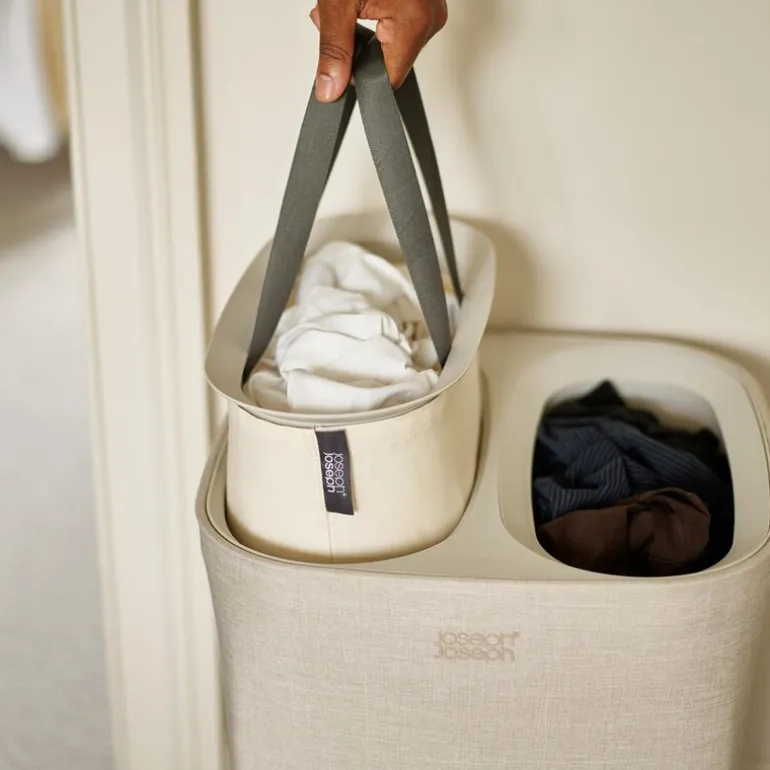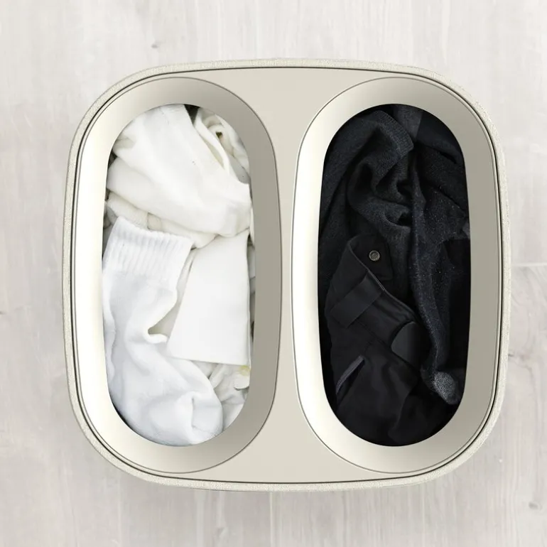 Tota skittentøyskurv på 60 liter kombinerer funksjon og estetikk i én løsning. Med to uttakbare poser på 30 liter kan du holde lyse og mørke klær adskilt. Posene er utstyrt med bærehåndtak og et ekstra grep i bunnen for enkel tømming i vaskemaskinen.
