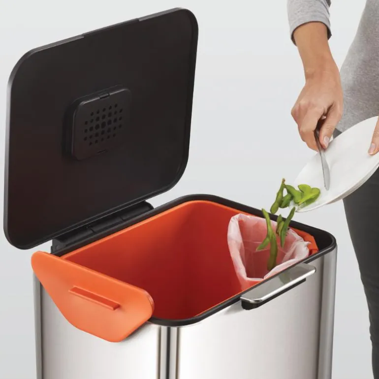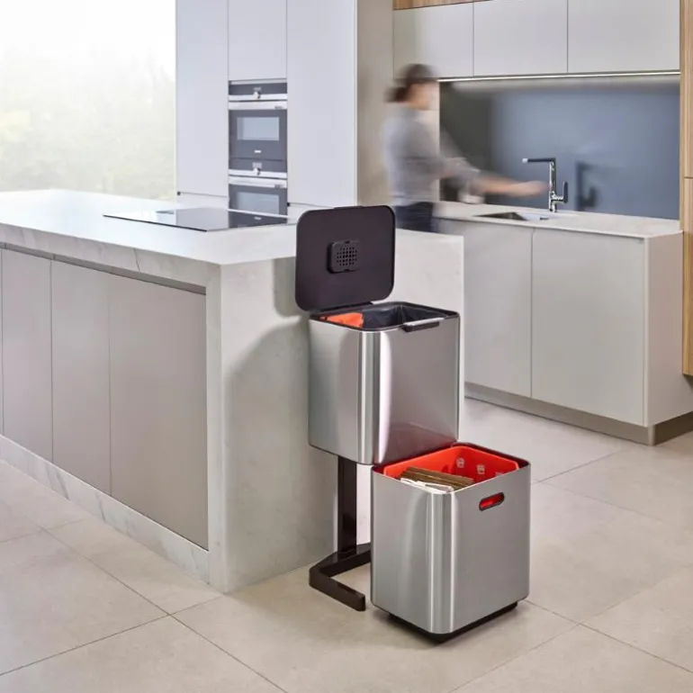 Designet inkluderer en 3-liters flyttbar beholder for matavfall som kan lagres enten inne i enheten eller på benkeplaten. Skreddersydde avfallsposer for hovedrommene og nedbrytbare poser for matavfall er tilgjengelige separat, i tillegg til utskiftbare luktfilter.
