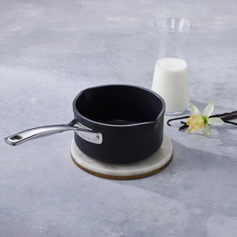 Den nye generasjonen av non-stick- produkter har et belegg som er fire ganger mer slitesterk enn tidligere. Melkekjelen fra Le Creusets Toughened Non-Stick-serie egner seg spesielt godt til tilberedning av sauser, grøt og andre småretter som inneholder melkeprodukter og egg. Kjelen har to helletuter slik at innholdet kan helles ut på begge sider. Toughened Non-Stick-serien er fremstilt av presset aluminium, som er en effektiv varmeleder. Dette gjør kjelen ideell til tilberedning av hurtige retter.Kjelen har non-stick-belegg både innvendig og utvendig, noe som gjør den enkel å rengjøre. Dessuten kan du bruke mindre fettstoffer i matlagingen.