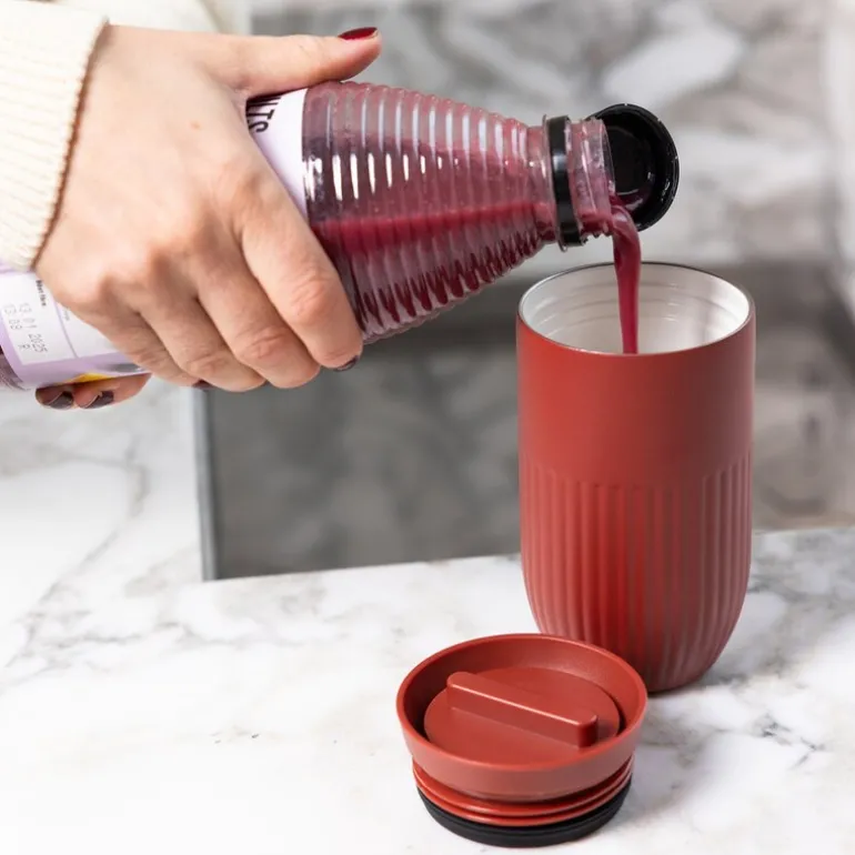 Det elegante pulverlakkerte utsiden er laget av sømløst resirkulert rustfritt stål og har de karakteristiske Saga-rillene som tilfører et moderne og unikt preg. Tova er også svært praktisk i bruk – den er lekkasjesikker og enkel å rengjøre, noe som gjør den ideell både for kaffe, te og smoothies.
