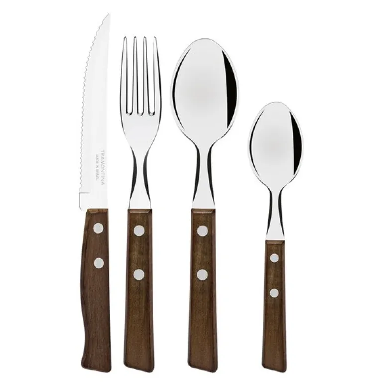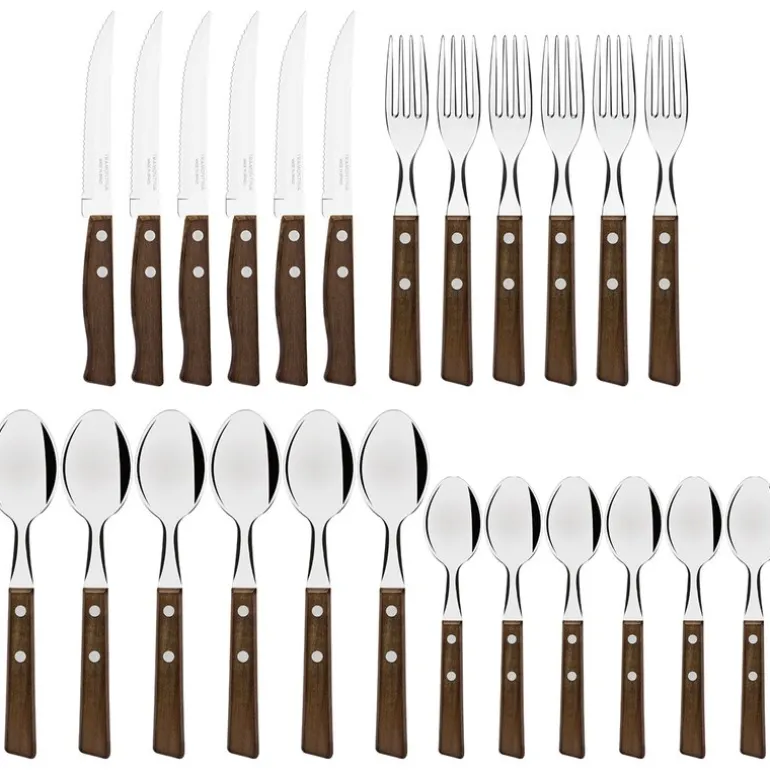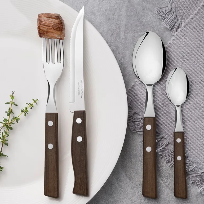 Tradicional bestikksett 24 deler fra Tramontina er et stilfullt bestikksett med brune håndtak, designet for å gjøre hvert måltid til en glede. Settet er ideelt for seks personer og er laget med fokus på både holdbarhet og eleganse.