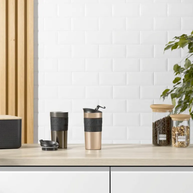 Bodum Reisekopp er ideell til dagpendling, ferier, treningssenteret eller til en tur med hunden. Koppen er designet for å være med hvor hen du går, og sikrer at din kaffe, te eller annen favorittdrikk alltid er innen rekkevidde, selv når du er langt hjemmefra. Sentralt i Reisekoppens stilfulle, strømlinjeformede design står vårt innovative, isolerende dobbeltveggsystem. Den holder varm og kald drikke på sitt beste i timevis, slik at du kan nyte hver eneste lille slurk.
