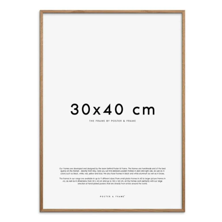 Dekorativ treramme 30×40 cm i lys eik fra Poster & Frame. Kvalitetsrammer av kortreist nordisk treverk, produsert i Poster & Frame sin fabrikk i Danmark. Ved 100 % egenproduksjon, har Poster & Frame tatt full kontroll over sin egen forsynings-kjeden, og sørger dermed også for å redusere sitt klimaavtrykk.