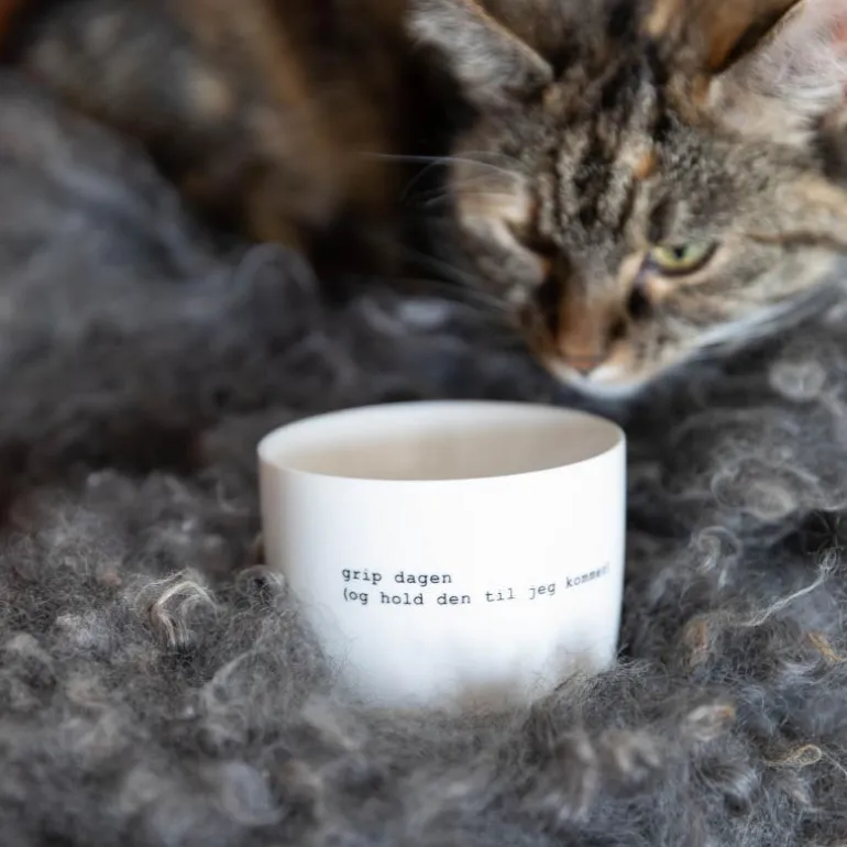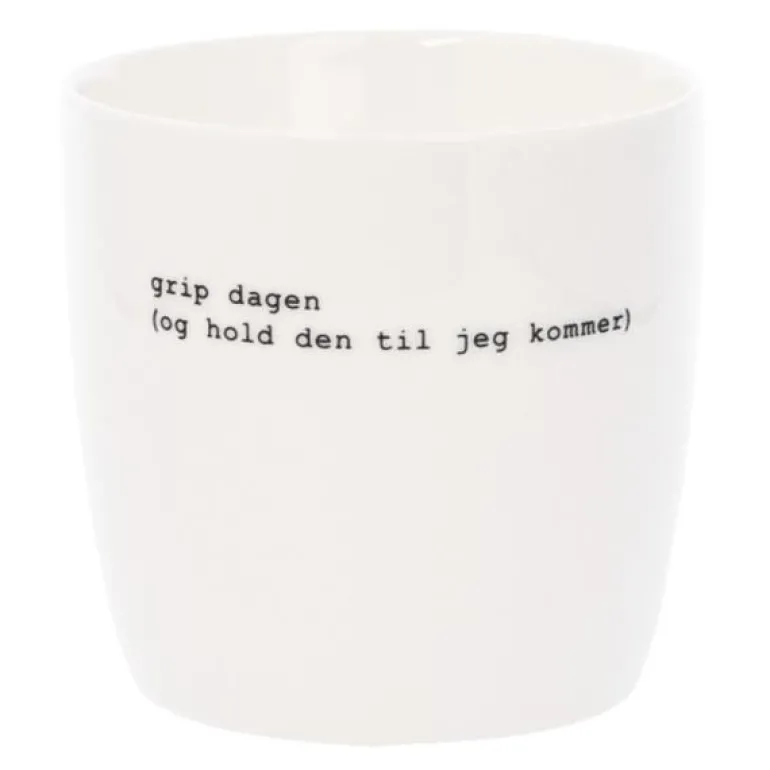 Hvitt krus med svart tekst, fra Sögne Home. Teksten på kruset er skrevet av Trygve Skaug som er låtskriver, poet og musiker.Teksten på kruset:grip dagen(og hold den til jeg kommer)Det håndlagde sögne kruset så dagens lys i 2013, og har med sitt tynne porselen og gode hank, blitt manges favoritt! Vår samling av krus kommer i ulike farger, størrelser og utvalgte populære tekster. Sögne sine krus er blitt folkekjære favoritter som vi er stolte av! Krusene er med sitt tidløse design laget for å vare i generasjoner og fylle din dag med et treffende hverdags budskap. Krusene er hyggelig å bruke der du er med familie, venner, kollegaer og som gave for ulike anledninger.