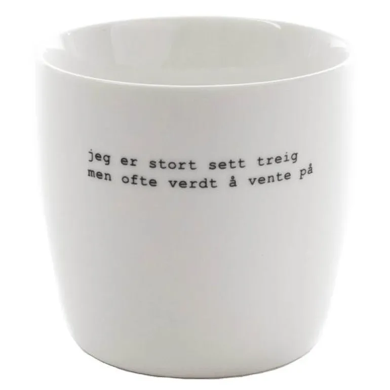 Praktisk og robust, det rommer 300 ml, tåler oppvaskmaskin og er ildfast. Med målene 9×9 cm har det et stilig, rent uttrykk i hvitt porselen, med tekst i sort – et lite stykke hverdagsglede i hver kopp.