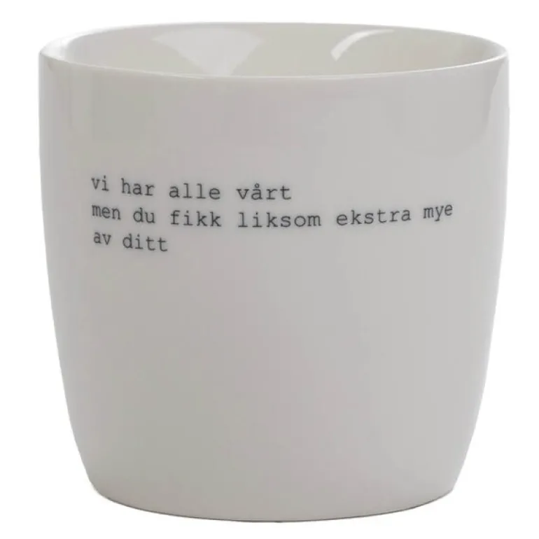 Trygve Skaug krus vi har alle vårt 30 cl i hvit. Med en varm og ærlig tekst fra Trygve Skaug – «vi har alle vårt, men du fikk liksom litt ekstra mye av ditt» – byr dette håndlagde kruset fra Sögne Home på mer enn bare funksjon. Det er en liten oppmuntring i porselen, perfekt som gave eller som daglig påminnelse om omsorg.