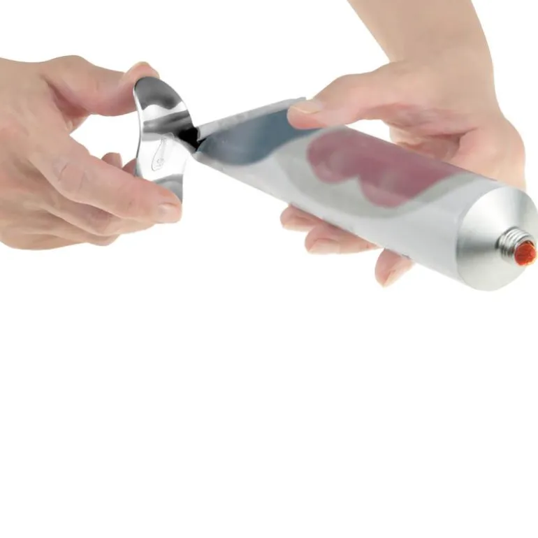 Få maksimalt ut av tuben med tubepresser fra I Genietti. Tubepresseren festes på tubens bunn, og ved å vri den rundt, vil innholdet bli sakte presset oppover i tuben. Virker best på metalltuber.
