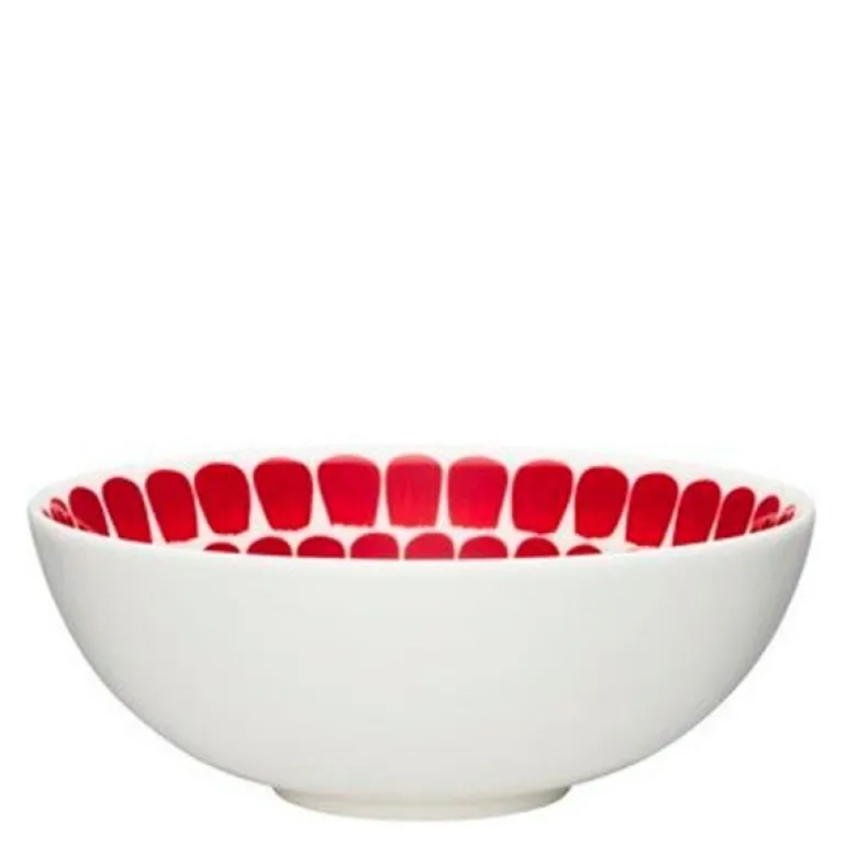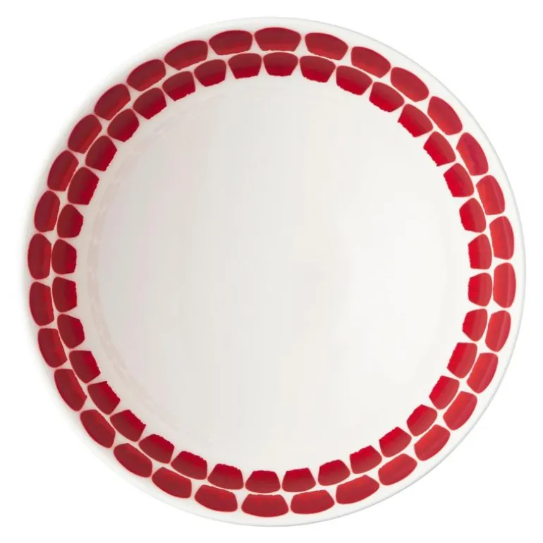 Tuokio dyp tallerken 18cm rød. Øyeblikket i dekorasjonen er en håndmalt følelse som bringer en rytme til mønsteret der penselstrøk er sterkt til stede. Mønsteret, designet av den finske designerduoen Helorinne og Kallio, er inspirert av Arabias mer enn 140 år gamle dekorative tradisjon, sterke keramiske kunnskap og utnyttelse av den, og respekterer det gamle og skaper nye. Tuokio-mønsteret pryder Heikki Orvolas tydelige Arabia 24h-serie. Kan vaskes i oppvaskmaskin, tåler mikrobølgeovn.