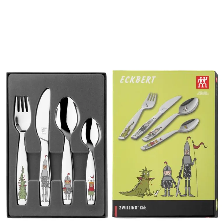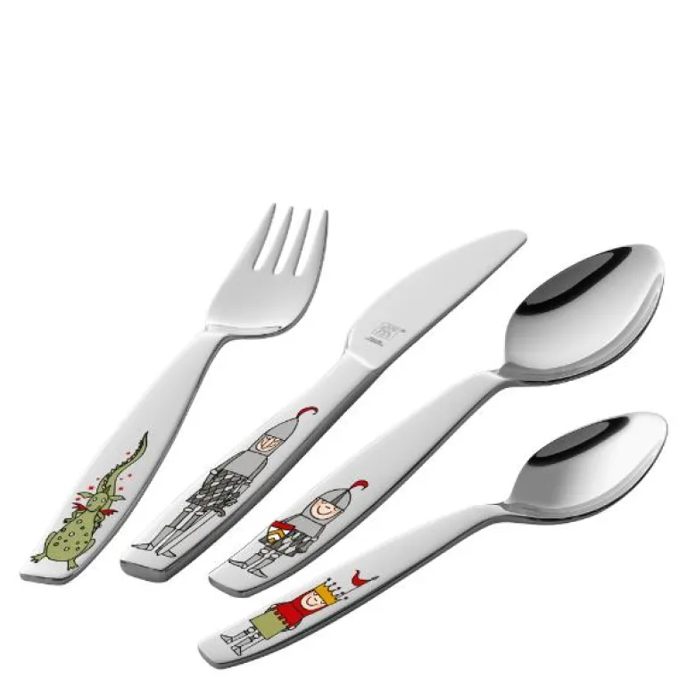 Barnebestikk Twin Kids Eckbert ridder fra Zwilling. Et lekent bestikksett for barn, med morsomme motiver av forskjellige riddere og drager, som sprer godt humør rundt bordet. Alt bestikk er laget av 18/10 rustfritt stål og er spesialdesignet for barnehender. Barnevennlig design med stump kniv og avrundede gaffelspisser.