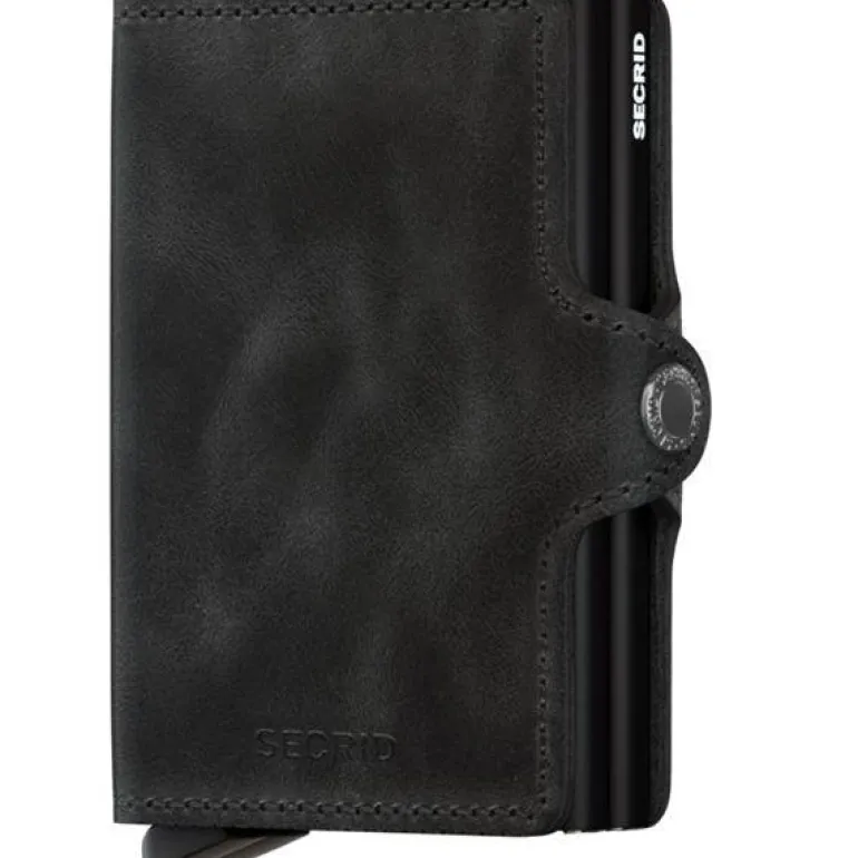 Secrid Twinwallet Vintage black har skinnomslag som er forsiktig slipt og vokset slik at overflaten får et stenvasket utseende der riper og slitasje vil sette seg i læret og gi lommeboken et levende og personlig uttrykk over tid.Selve kortholderen er i aluminium med patentert skyvesystem som gjør det enkelt å få tak i akkurat det kortet du trenger ved hjelp av et lett trykk på utløserknappen. Kortholderen beskytter kortene fra å bøyes eller knekke, og sikrer kortene mot tyveri ved at den blokkerer for trådløs avlesning. Med Twinwallet får du plass til dobbelt så mange kort fordelt på to kortholdere som hver har plass til 4-6 kort, totalt 8-12 kort.Omslaget i mykt skinn gjør at kortholderen fungerer som en lommebok med plass til sedler, billetter og annet.Secrid har stor suksess med sin kortholder som ble lansert i 2009,og mye av dette skyldes en unik kombinasjon av moderne produksjonsteknikker , godt kvalitesskinn og et gjennomtenkt design.Selve kortholderen er i aluminium og dette gir den lav vekt , men beskytter også kortene mot å bøyes eller knekke, og den sikrer kortene mot tyveri så lenge de er inni kortholderen.(RFID sikker ; radio-frequency identification).Ved hjelp av en liten knapp skyves kortene ut av holderen slik at man enkelt får tak i det kortet man skal bruke.Secrid Miniwallets er et stort spekter av kortholdere med skinnomslag som gjør at kortholderen også fungerer som en liten lommebok der man kan oppbevare sedler ,billetter og annet.Hver kortholder rommer 4-6 kort ; 4 kort med opphøyet preging og opp til 6 kort uten preging.