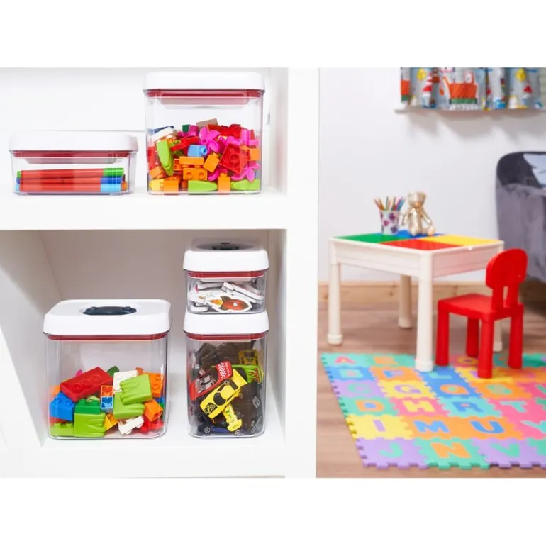 Beholderen kan settes i oppvaskmaskinen for enkel rengjøring, og lokket skilles for grundig håndvask. Oppbevaringsboksene er laget av BPA-fri plast, er trygge og holdbare og har 5 års garanti mot materiale og produksjonsfeil