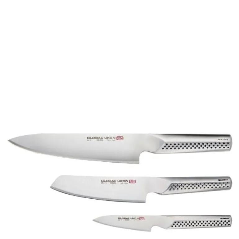 Ikke glem å vedlikeholde knivene ved å vaske dem for hånd og tørke dem umiddelbart etter bruk. Med Global Ukon knivsett 3-deler er du klar til å håndtere enhver matlagingsoppgave med stil, presisjon og pålitelighet.