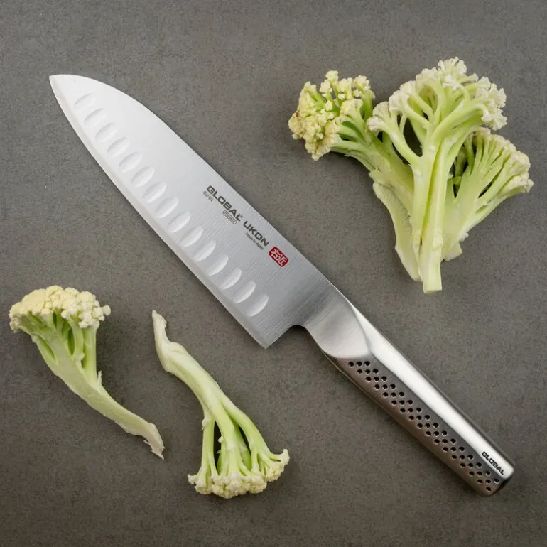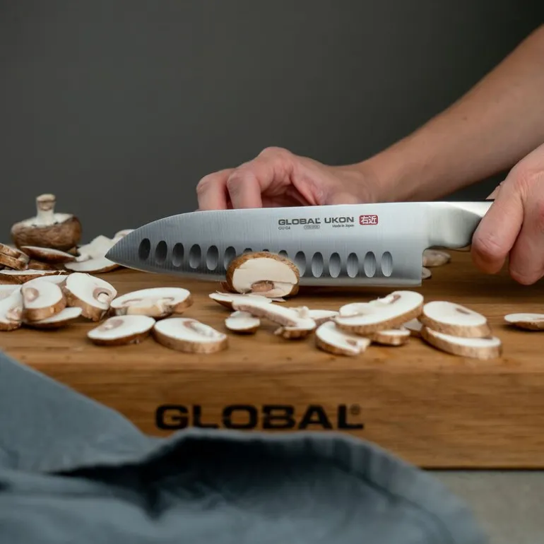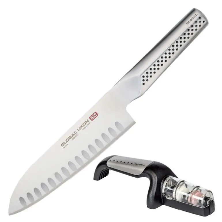 Global UKON knivsett bestående av GU-04, en hullslipt Santoku-kniv på 19 cm, og G-91/SB, en knivsliper med keramiske slipeskiver. Santoku er en japansk knivmodell som ligner på en klassisk kokkekniv. Forskjellen er at knivbladet er noe kortere og har en avrundet spiss. Oversatt fra japansk betyr Santoku «tre oppgaver», og kniven er best egnet for tre oppgaver: skjære, terne og hakke. Denne modellen er hullslipt, noe som betyr at bladet har små fordypninger som gjør at råvarene ikke like lett fester seg til kniven når du skjærer.