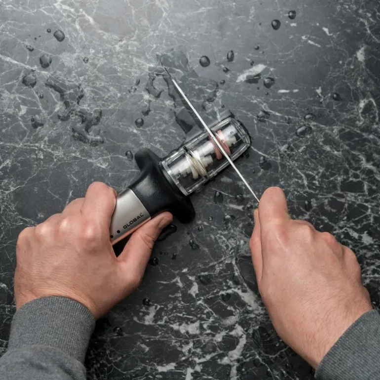 G-91/SB knivsliper med 2 hjul er spesielt utviklet for asiatiske kniver og hjelper deg med å holde knivene skarpe over lang tid. Ta vare på kjøkkenknivene dine ved å slipe dem jevnlig med Globals knivsliper. Alt du trenger å gjøre er å fylle knivsliperen med litt vann og dra kniven gjennom de ulike slipeskivene, så blir den like skarp som ny. Knivsliperen har slipeskiver i to ulike grovheter: en medium (kornstørrelse 240) og en fin (kornstørrelse 600). Kniven skal ikke brukes på frossen mat eller ben og bør håndvaskes for å bevare skjæreegenskapene.