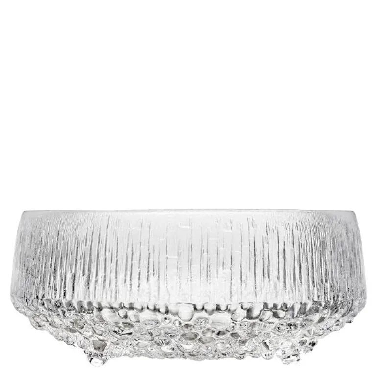 Ultima Thule skål m/ben 200mm. Design Tapio Wirkkala 1968. Smeltende is i Lappland var Tapio Wirkkalas inspirasjon da Ultima Thule ble til, men overflaten på Ultima Thule ble opprinnelig skapt da Wirkkala på 1960-tallet eksperimenterte med å helle glødende glassmasse i grafiske treformer han hadde skåret i. Mønsteret ble gradvis endret ettersom glasset brant seg inn i overflaten på treformene. Det eksklusive designet gjenspeiler de tusentals timer som har blitt brukt for å finjustere glassblåseteknikken, som kreves for å produsere effekten i glasset. Ultima Thule-skålen er et vakkert serveringsfat til frukt eller desserter. Fantastisk gave.Kan vaskes i oppvaskmaskin.