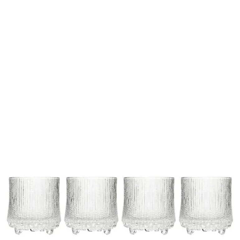Ultima Thule whisky 28cl 4-pk. Design Tapio Wirkkala 1968. Smeltende is i Lappland var Tapio Wirkkalas inspirasjon da Ultima Thule ble til, men overflaten på Ultima Thule ble opprinnelig skapt da Wirkkala på 1960-tallet eksperimenterte med å helle glødende glassmasse i grafiske treformer han hadde skåret i. Mønsteret ble gradvis endret ettersom glasset brant seg inn i overflaten på treformene. Det eksklusive designet gjenspeiler de tusentals timer som har blitt brukt for å finjustere glassblåseteknikken, som kreves for å produsere effekten i glasset. Ultima Thule whiskyglass er perfekt for drinker, cocktailer, vann eller juice.Kan vaskes i oppvaskmaskin.