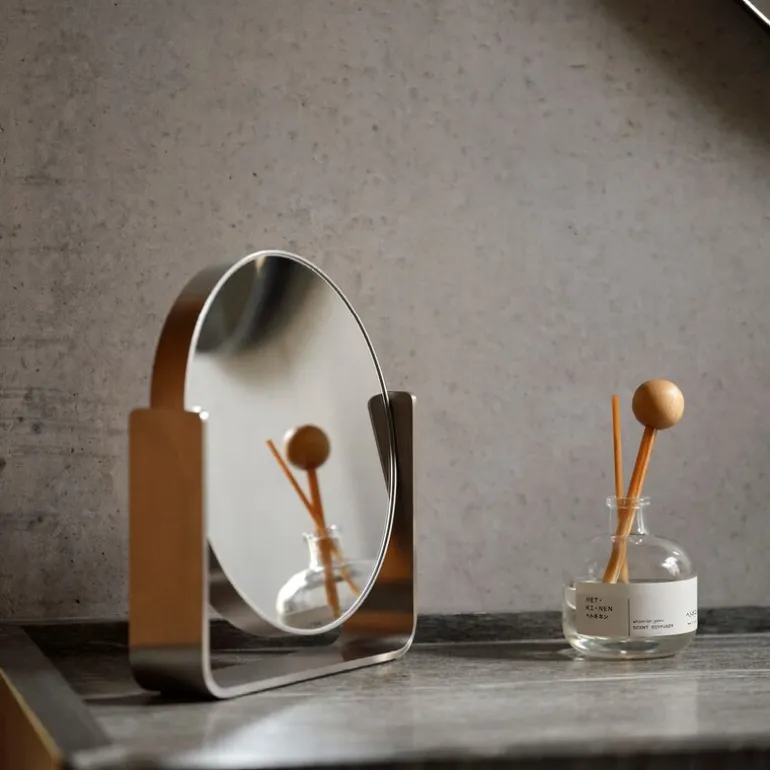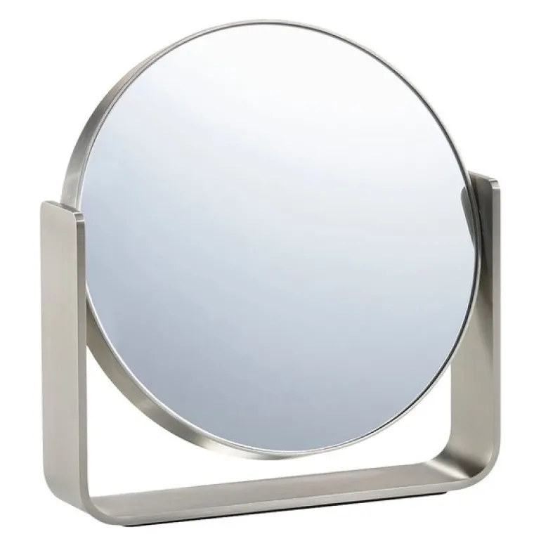 Den avrundede formen og den matte overflaten skaper en raffinert balanse mellom det myke og det kjølige, samtidig som stålet reflekterer lyset subtilt og tilfører speilet dybde og karakter. Med en vippefunksjon og 5x forstørrelse gir speilet optimal brukervennlighet for detaljert sminke- og hudpleie.