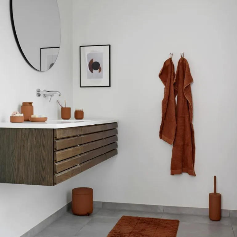 Ume såpeskål 12 cm terracotta, fra Zone. Den flotte Ume såpeskålen har en behagelig myk overflate og praktiske spor som fører overflødig vann unna. Fargene matcher de øvrige elementene i Umes baderomsserie, som designertrioen VE2 står bak. Diameter 12 cm, høyde 3 cm.