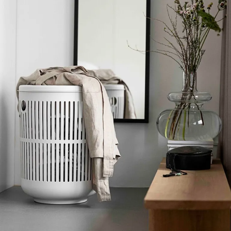 Kurven har et avtakbart lokk, men for mindre plagg som sokker og undertøy kan du bruke åpningen i midten for rask og enkel sortering. På sidene finnes to små hull som fungerer som håndtak, noe som gjør det enkelt å flytte kurven etter behov.