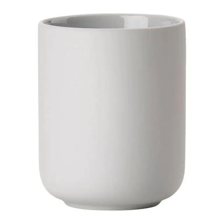 Zone Ume Tannbørsteholder Dia. 8,3 x 10,3 cm Soft Grey. Tannbørstekruset fra baderomsserien Ume er tilgjengelig i de fineste, milde fargene. Det er et mykt og behagelig bekjentskap, og det er designertrioen VE2 som står bak designen av seriens velproporsjonerte elementer. Høyde 10,3 cm. Elementene i baderomsserien Ume gir et solid og velbalansert uttrykk – både for øyne og hender. Ume er det japanske ordet for plommetre, og et symbol på eleganse, tålmodighet og styrke. Den første bokstaven, U, bestemmer seriens form, som er moderne og klassisk på samme tid, med gjennomtenkte og funksjonelle detaljer.Såpedispenseren har for eksempel en lang tut for optimal pumpefunksjon, og toalettbørsten er utstyrt med en praktisk innvendig kopp slik at overflødig vann enkelt kan tømmes ut – og børsten har god arbeidslengde og glir lett på plass i holderen.Den elegante søppeldunken har samme høyde som toalettbørsten, og sammen danner de et fint par på baderomsgulvet. Det separate og romslige innerspannet på 4 liter er utstyrt med en ny, smart finesse, slik at man enkelt kan montere søppelposen uten at den kommer i klem eller blir synlig fra utsiden.