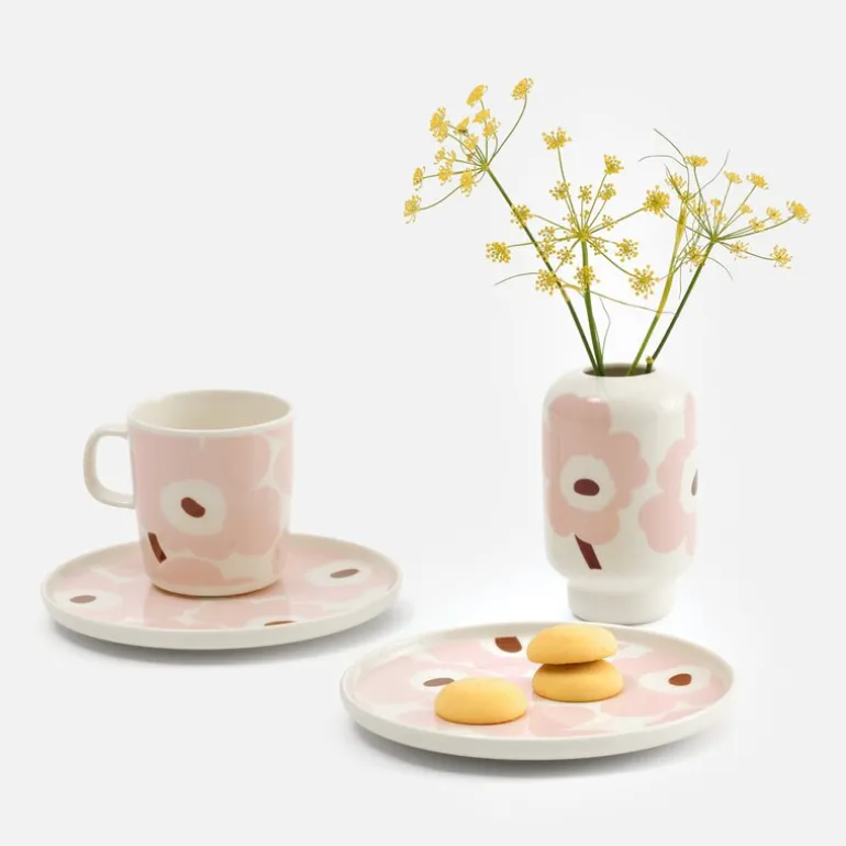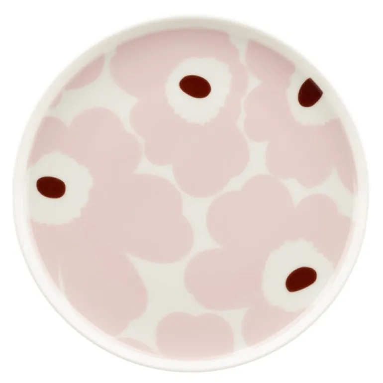 Asjetten har det ikoniske Unikko-mønsteret, skapt av Maija Isola i 1964, i en tid hvor blomsterdesign var sjeldne i Marimekkos kolleksjoner. Inspirert av ønsket om å skape noe nytt og spennende, utviklet hun en hel serie med blomsterprint som har blitt en av Marimekkos mest gjenkjennelige design. Fargepaletten i hvitt, lys rosa og chestnut gir asjetten et moderne og sofistikert uttrykk.