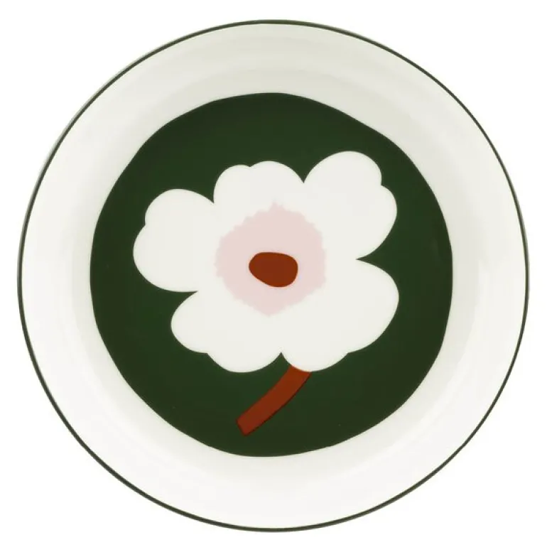 Oiva Unikko-tallerken 20,5 cm i hvit/mørk grønn/rosa fra Marimekko er både en vakker og holdbar tallerken, ideell for både hverdagsbruk og fest. Tåler oppvaskmaskin, ovn, mikrobølgeovn og fryser, og tilbyr derfor fleksibilitet og funksjonalitet i en travel hverdag.