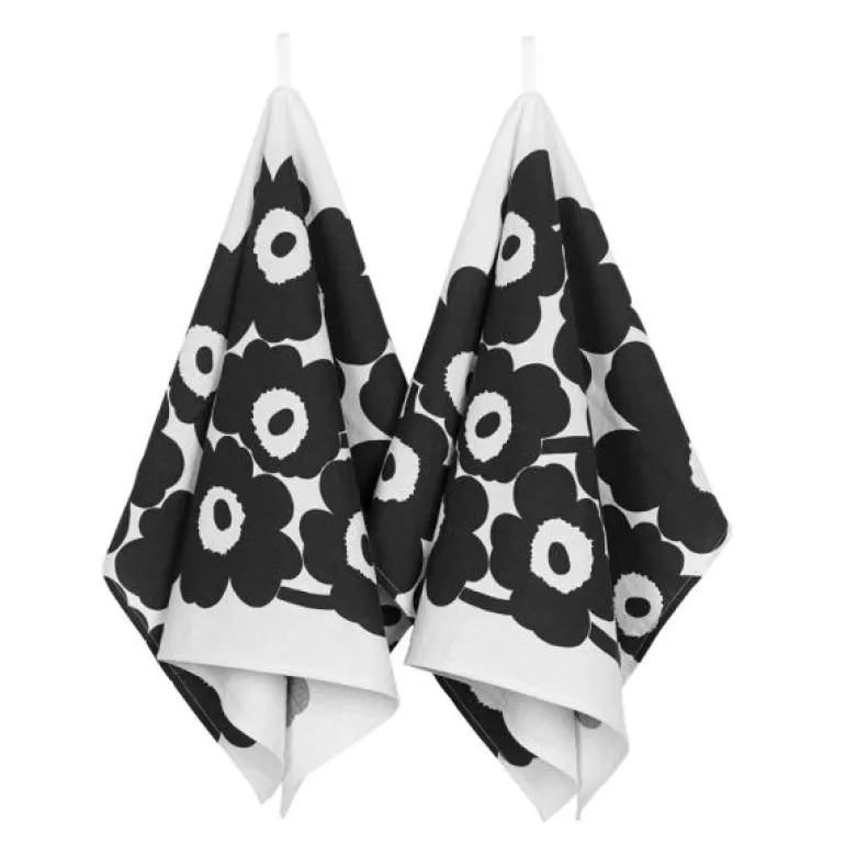 Settet inneholder to kjøkkenhåndklær i en bomull-lin-blanding med Unikko-motivet. Det litt teksturerte vevde stoffet er laget av 61 % bomull, 39 % lin. Marimekkos berømte valmuemønster Unikko ble født i 1964 i en tid da designhusets kolleksjoner stort sett inneholdt abstrakte trykk. Designer Maija Isola ønsket å skape noe interessant fra dette organiske temaet og designet en hel rekke blomstertrykk. I dag representerer den ikoniske blomsten kreativitet.