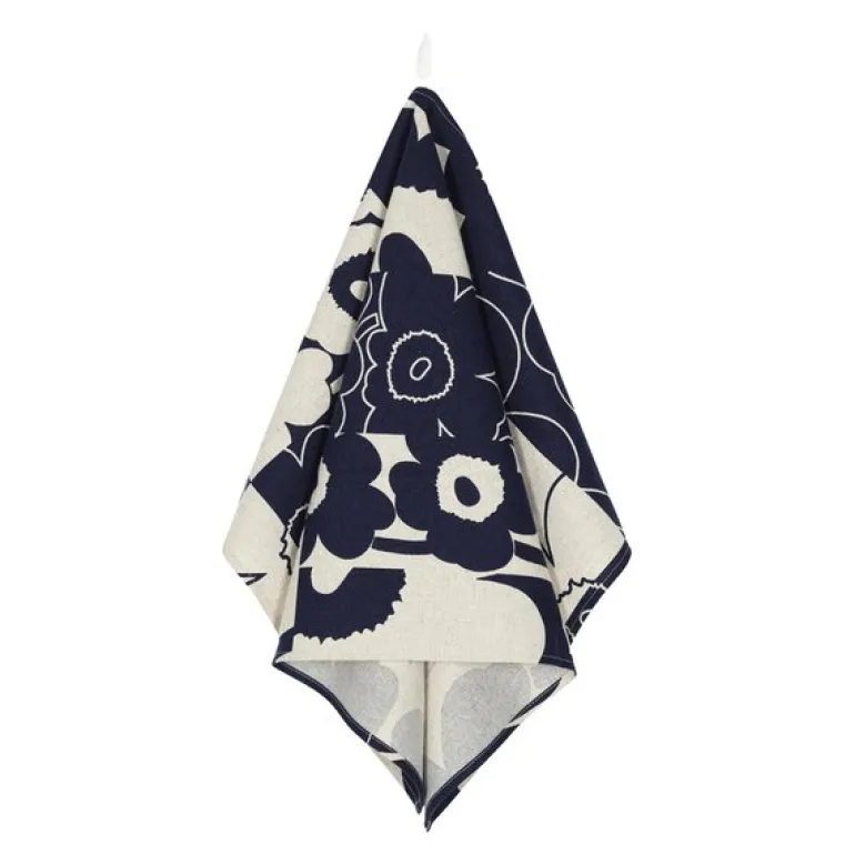 Unikko Kollaasi kjøkkenhåndkle i beige og mørkeblå fra Marimekko er en stilfull og praktisk kjøkkentekstil. Laget av en ubleket blanding av bomull og lin, tilbyr håndkleet både funksjonalitet og estetikk med sitt elegante design. Det har en opphengsløkke på langsiden for enkel opphenging og er en del av feiringen av 60-årsjubileet for Unikko-mønsteret, som også markeres med et spesielt jubileumsmärke.