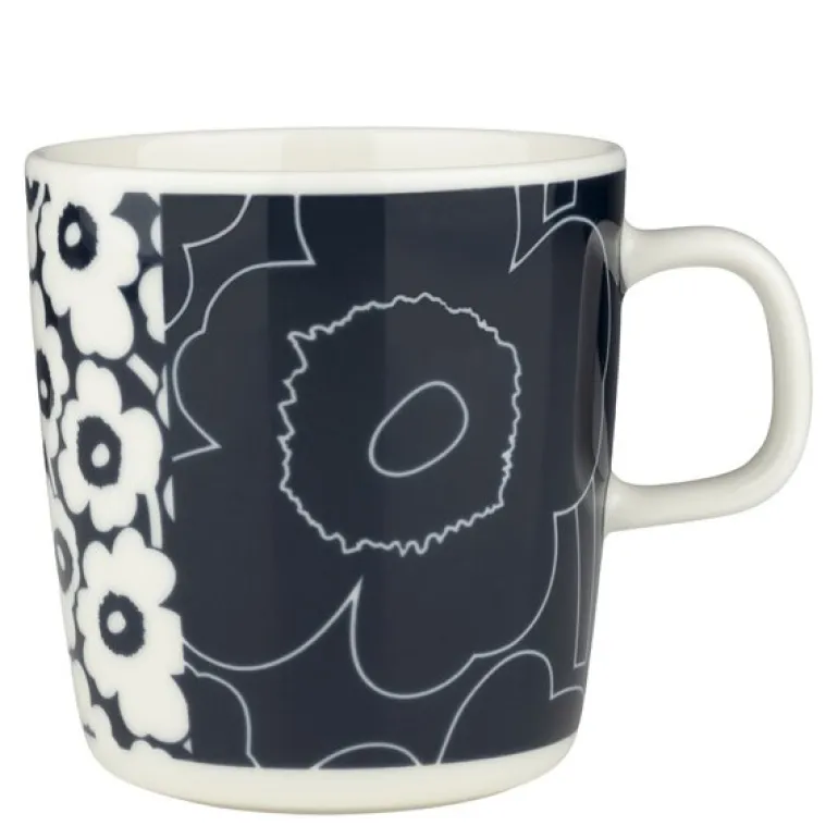 Unikko Kollaasi kopp på 40 cl fra Marimekko er dekorert med det ikoniske Unikko-mønsteret i hvitt og mørkeblått. Koppen er laget av hvitt steintøy, som gjør den robust og allsidig. Den tåler oppvaskmaskin, ovn, mikrobølgeovn og fryser, noe som gjør den praktisk til daglig bruk.