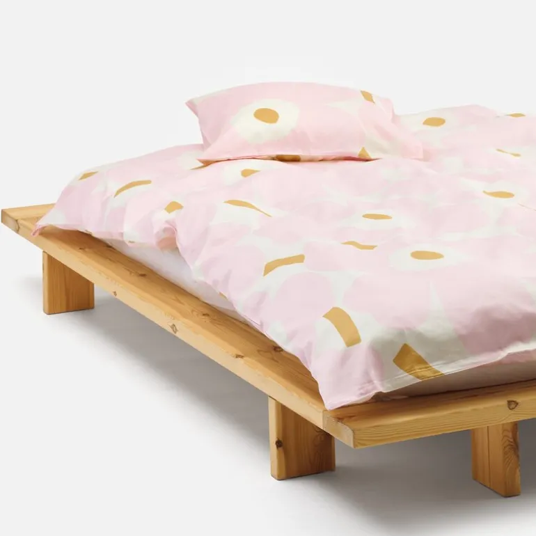 Mønsteret Unikko, designet av Maija Isola i 1964, er en av Marimekkos mest ikoniske designklassikere. De store, stiliserte blomstene i hvitt, rosa og beige skaper en rolig og harmonisk atmosfære som passer i ethvert interiør.