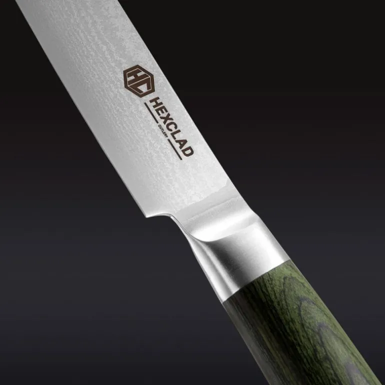 Skogsgrønt håndtak på universalkniv 13 cm fra Hexclad. Fra Hexclad og Gordon Ramsay kommer nå de aller beste knivene. Kokkens forlengede arm og et hvert kjøkkens viktigste redskap for å tilberede mat. Knivene fra Hexclad kombinerer det beste fra knivverden med ekte 67-lag japansk damaskusstål og et vanvittig vakkert og ergonomisk håndtak av skogsgrønn pakkatre.