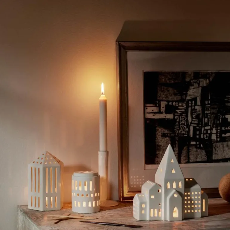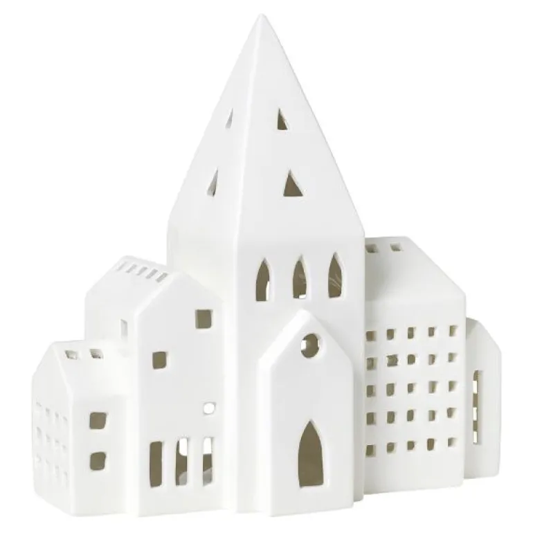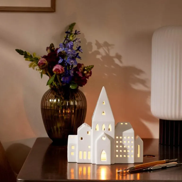 I år gjør et nytt, større Urbania-lyshus sin entré i Kählers serie av arkitektoniske lyskilder, hvor det varme, levende lyset kaster et vakkert skyggespill fra toppen av byen. Det nye Lyshus City har form som en rad bygninger med flere små hus, og minner kanskje mest av alt om en del av et bytorg. Det er plass til et telys inne i bygningen ? eller byen ? og du velger selv om du vil bruke LED eller stearin. Lyshuset er 20 cm bredt og 8 cm dypt og passer fint i vinduskarmen eller som dekorasjon på bordet, kommoden eller reolen, hvor det vil skape deilig julestemning i hele desember. Alle Urbania-lyshus er designet av Mette Bache og Barbara Bendix Becker og kjennetegnes ved en særlig formgivning, hvor bygningens stramme silhuett skaper rom for kreativitet i utformingen av hvert enkelt vindu.