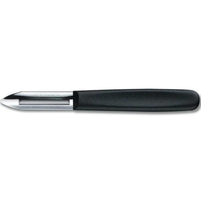 Victorinox potetskreller med enkelt knivblad i rustfritt stål og sort plastskaft. Skrelleren har fast blad som ikke roterer og passer til høyrehendte.Victorinox er et gammelt kvalitetsmerke på kniver fra Sveits.Det begynte med de verdensberømte Swiss Army Knives og produserte etterhvert kniver både til profesjonellt bruk og til hobby kokker.Victorinox har fokus på kvalitet, innovasjon og tradisjon.I de senere år også produserer de i tillegg andre produkter som klokker, reiseartikler og dufter.