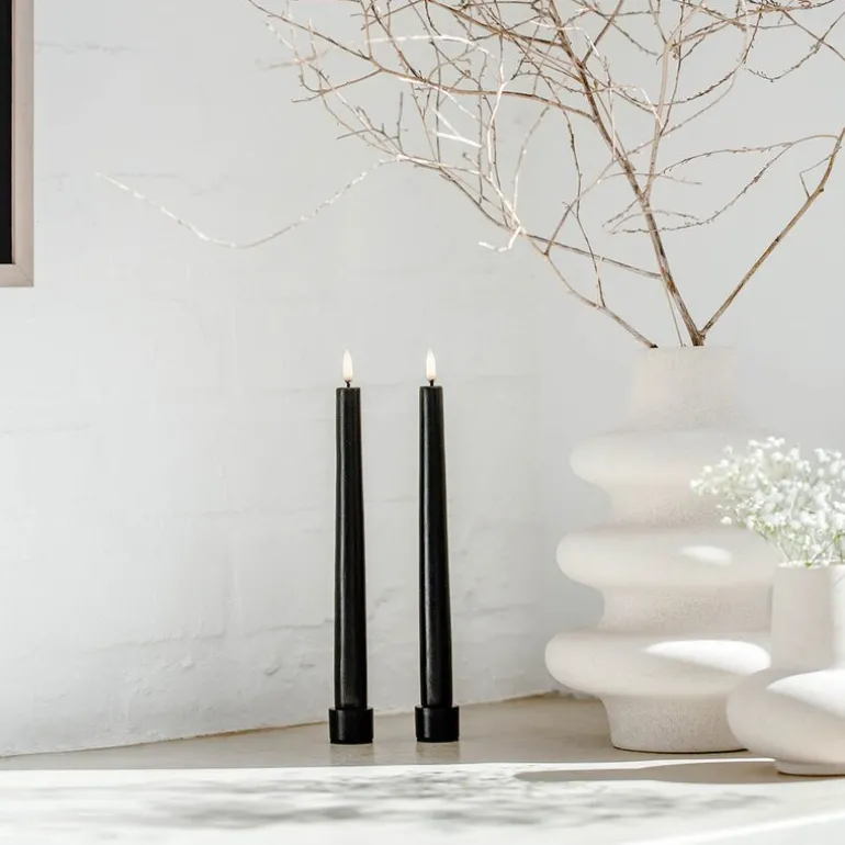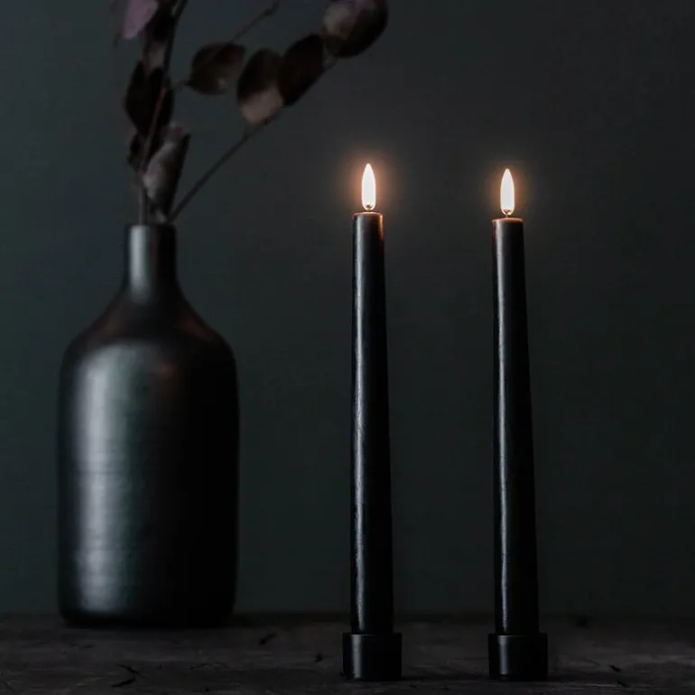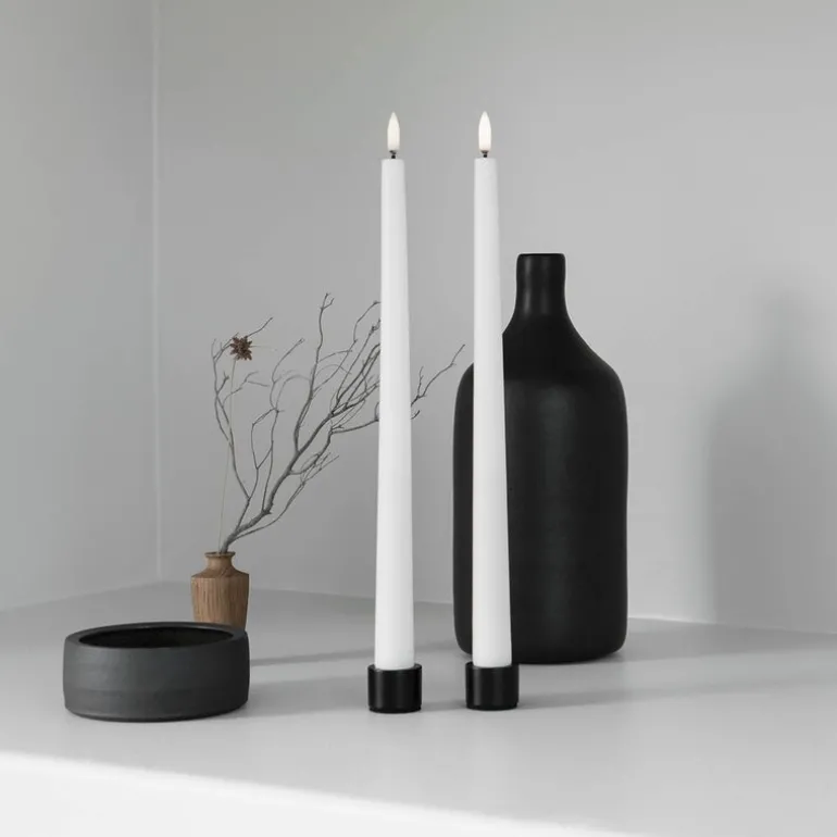 Uyuni lysestake 2 stk 2,3 cm i fargen svart. Utrolig flott lysestake til led lysene til Uyuni. Lysestakene har dyp bunn slik at lysene står sikkert.Uyuni lighting lager kunstige stearinlysene med LED-flamme og batteri. Som er et trygt alternativ til de levende lysene. Det er også enda bedre for inneklimaet, da de ikke gir sot fra flammen. Lysene er allergivennlige og er trygge for små barn og kjæledyr.
