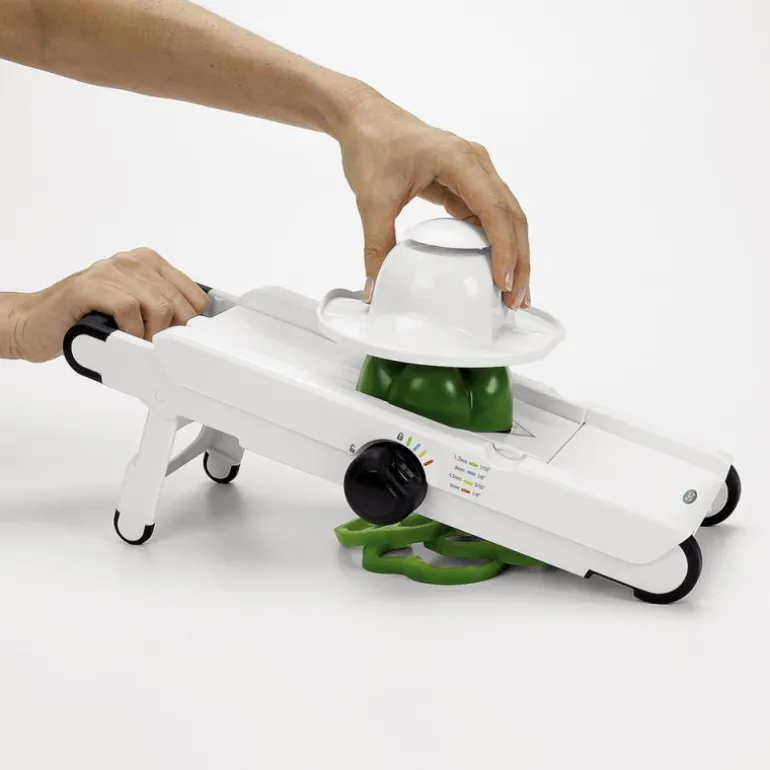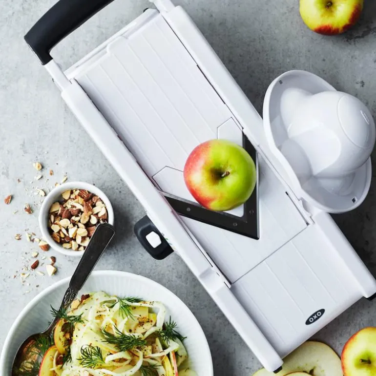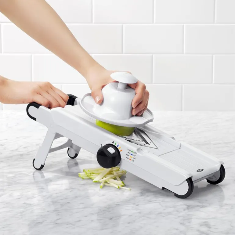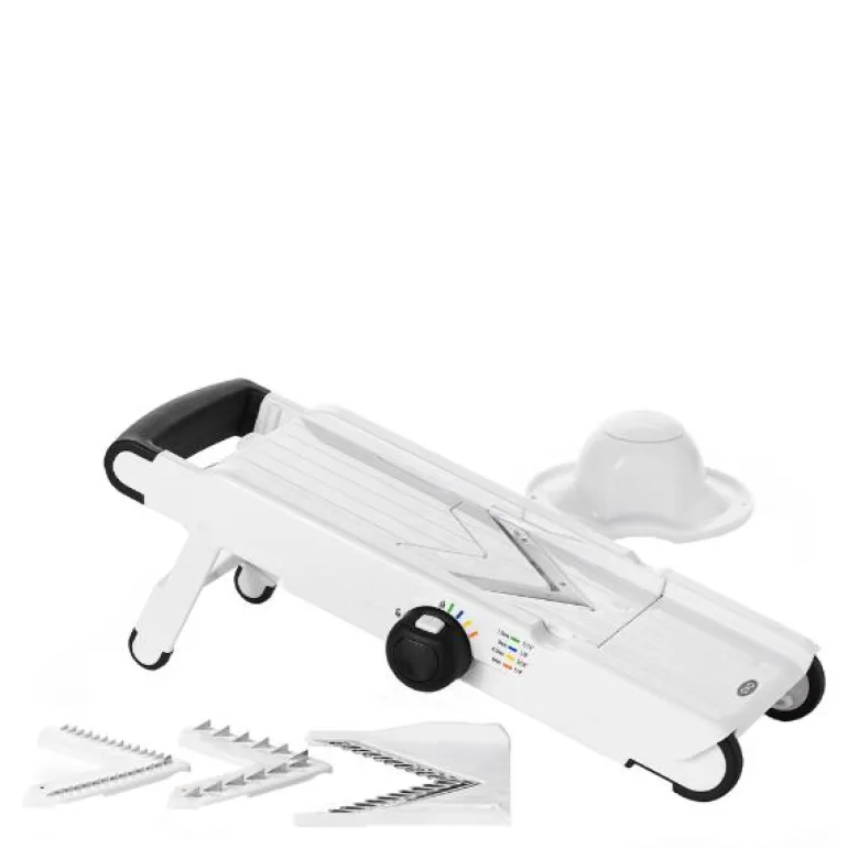 OXOs V-mandolin skjærer frukt og grønnsaker i tynne skiver, juliennestrimler, pommes frites og bølgete skiver. Et skarpt V-formet knivblad i herdet rustfritt stål skjærer lett og elegant gjennom både faste grønnsaker, poteter, og bløte frukter som f.eks. kiwi og tomat. Man kan velge mellom fire tykkelser: 1,5 mm, 3 mm, 4,5 mm och 6 mm. Det myke non-slip gummihåndtaket gir et godt grep når man bruker mandolinen, og den medfølgende holderen beskytter fingrene. Ben i bløt gummi sikrer at mandolinen står godt fast på underlaget. De forskjellige knivbladene oppbevares på undersiden av mandolinen. Mandolinen har en låsefunksjon for sikkert oppbevaring og tåler oppvaskmaskin.