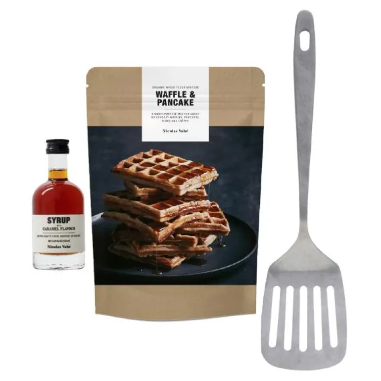 Nicolas Vahé Vaffel- og Pannekake Sett gir deg alt du trenger for å lage perfekte pannekaker og vafler hver gang. Blandingen sørger for at resultatet blir utsøkt, og du kan toppe det hele med deilig karamellsirup for ekstra smak. Settet inkluderer også en palettkniv i rustfritt stål, Daily, som gjør det enkelt å snu pannekakene med presisjon. Dette settet er en flott gave eller en praktisk løsning for å lage smakfulle frokoster og desserter hjemme.