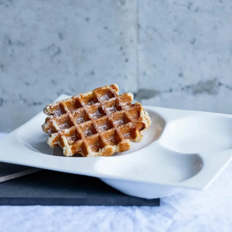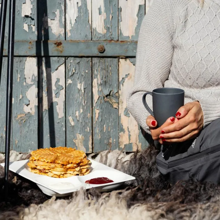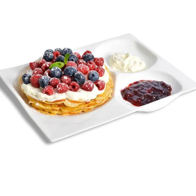 Server vafler med denne perfekte tallerkenen som har rom for både vaffel, syltetøy og rømme – eller skiver med brunost om du vil. Her har du alt i ett klart til innhogg av vaffeleskere!