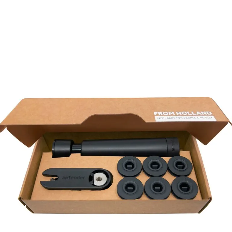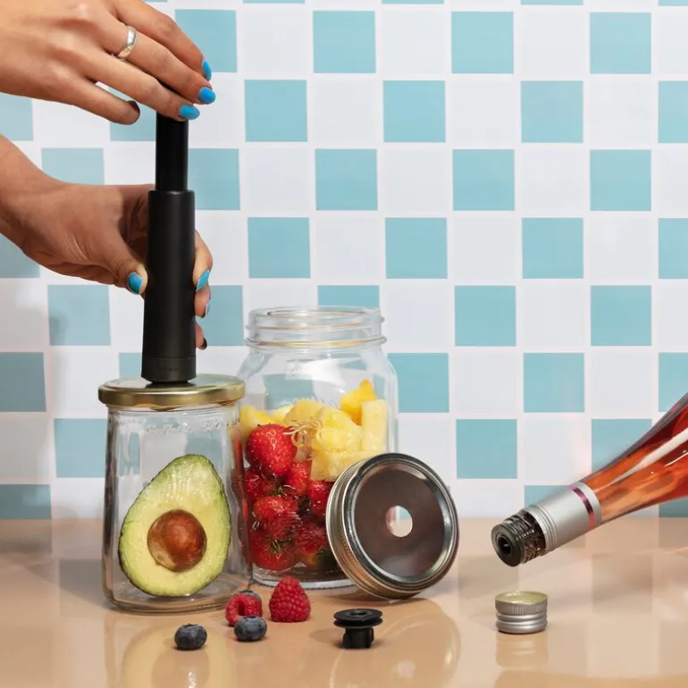 Settet inneholder en vakuumpumpe, 6 vakuumstoppere for vinflasker, og en hullmaker for å bruke vakuumfunksjonen på glass med metallokk, noe som gjør dette til et svært allsidig verktøy på kjøkkenet.