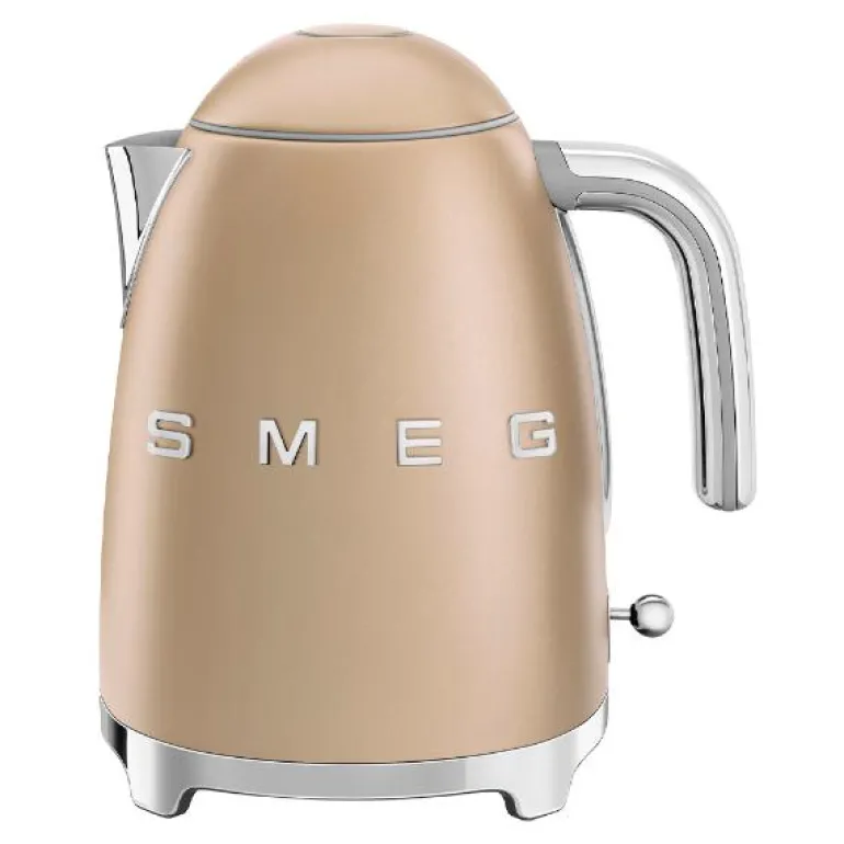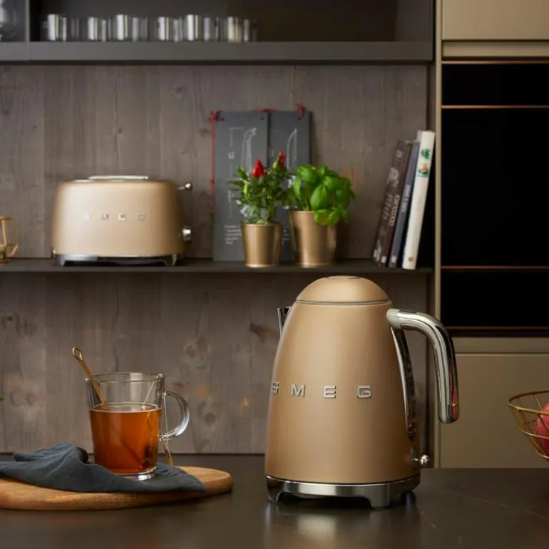 SMEG vannkoker (KLF03) i matt champagnefarget 50-talls retrodesign gir deg god grunn til å la vannkokeren stå fremme på benken. Med sitt sofistikerte og stilfulle utseende, i tillegg til utmerket kvalitet, vil SMEG vannkoker bli et praktisk designelement på kjøkkenet ditt – i lang tid framover.