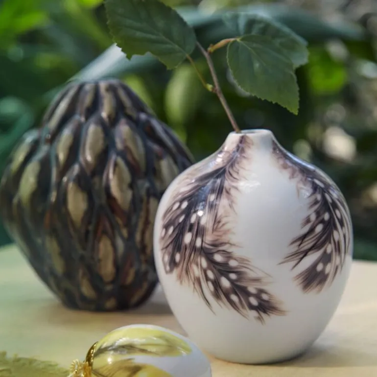 Med Vårkolleksjon vase 2025 perlehøne med høyden 13 cm hyller Royal Copenhagen sitt 250-årsjubileum ved å forene naturens skjønnhet med tidløs porselenskunst. Vasen er dekorert med brune fjær fra perlehønen, noe som gir den et unikt og varmt uttrykk.