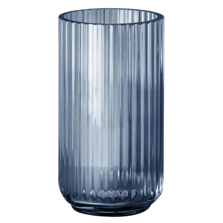 Vase 20 cm blått glass fra Lyngby. Den originale Lyngbyvasen i blått glass på 20 cm bidrar med klassisk eleganse til enhver vakker bukett. For få, men skulpturelle større blomster, og for sesongens grener. Alt er rett og slett vakkert i en glassvase fra Lyngby. Lysspillet i glasspilarene skaper et utrolig vakkert liv. Både når den har blomster i, men også når den står som en skulptur for seg selv. Denne størrelsen er også tilgjengelig i klart glass, men også i en spesiell røykfylt versjon som kler både blomster, grener og andre vaser.