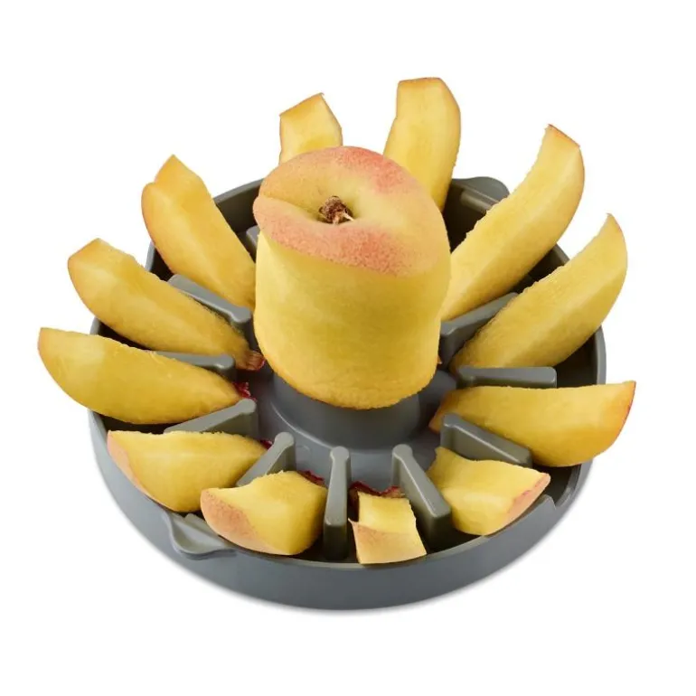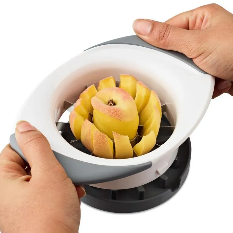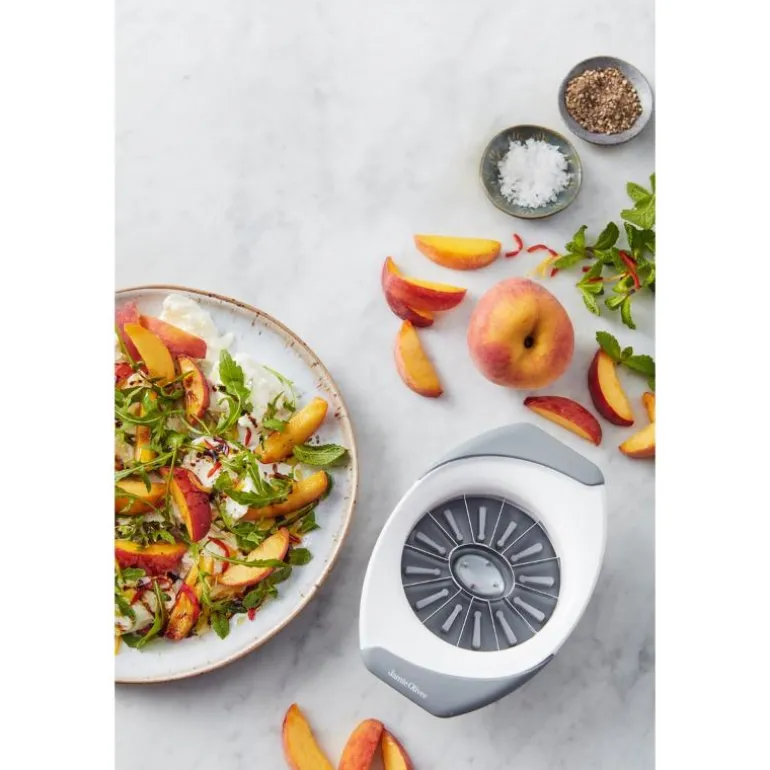 Med denne ferskendeleren fra Jamie Oliver deler du frukten din raskt og enkelt. Med sylskarpe kniver og dryppebrett blir dette en jobb med minimal innsats. Utformningen er spesielt tilpasset fersken og lignende frukt da kniven skjærer rundt den runde kjernen og gir bedre utnyttelse av fruktkjøttet. Bruk til for eksempel fruktsalater eller server båter som snacks. Saften som fanges i dryppebrettet kan enkelt tilsettes fatet for å berike smaken ytterligere. Rengjøres i oppvaskmaskin.