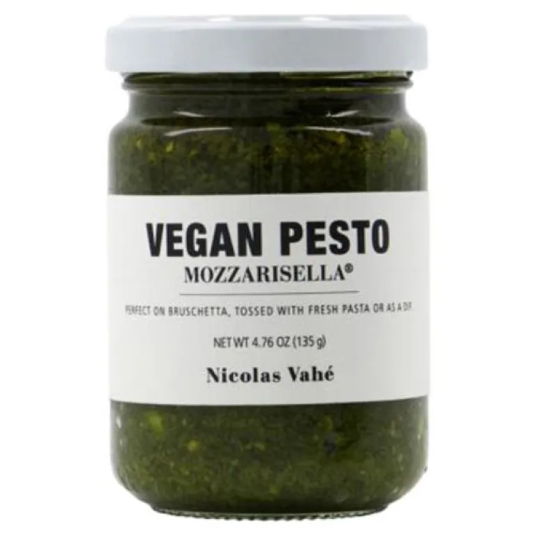 Nicolas Vahé sin veganske pesto med mozzarisella er et perfekt tilbehør til pasta og andre retter. Denne fyldige pestoen erstatter tradisjonell parmesan med en risbasert mozzarisella, som gir en deilig kremet konsistens. Blandingen av pinjekjerner, cashewnøtter og olivenolje tilfører en rik og nøtteaktig smak, som gjør den til et smakfullt vegansk alternativ. Nyt den på pasta, som et smørbart tilbehør eller i salater for en smakfull opplevelse.