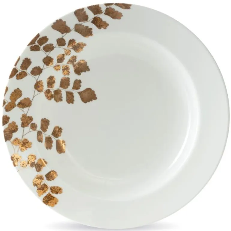 Vera Jardin Rim Soup Plate 22cm/9in. Vera Jardin fra Wedgwood er inspirert av Veras Wangs kjærlighet til kunst og personlige samling av botaniske illustrasjoner. Skimrende, varme blomster i gull og bronse på et rent hvitt bakteppe, er perfekt for middagsselskaper med familie og venner. Alle produktene presenteres i stilige Vera Wang Wedgwood-gaveesker.