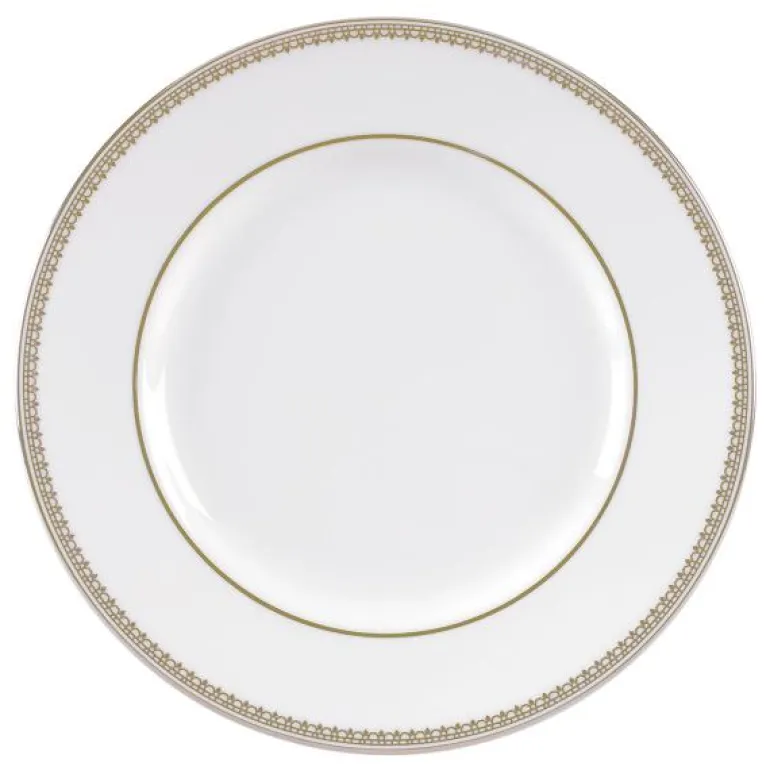 Vera Wang Lace Gold Plate 15cm/6in. Lace-kolleksjonen er inspirert av de fargerike corsagene fra den anerkjente New York-designeren Vera Wangs brudekolleksjon, og er preget av diskret eleganse. Kolleksjonen har to ulike blondekanter og noen deler har i tillegg fått blomster som slynger seg over det hvite, delikate benporselenet. Det gjør serviset unikt, og fremstår elegant og luksuriøst.
