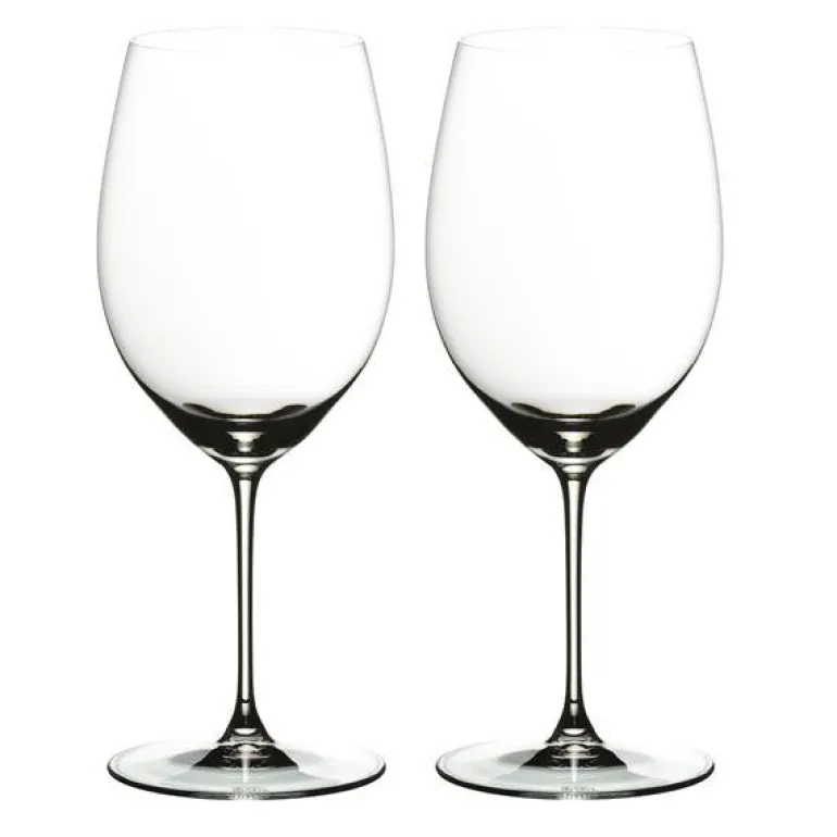 To stykk druespesifikke vinglass, Cabernet/Merlot, i den tynnere Riedel Veritas serien. Vinglassene har en stor, høy klokke med forholdsvis stor åpning. Klokkens form hever opplevelsen av vinen ved å redusere bitterheten og dempe den mest aggressive syren. Det får fruktsødmen til å tre frem og vinen får en rundere og fyldigere smak.