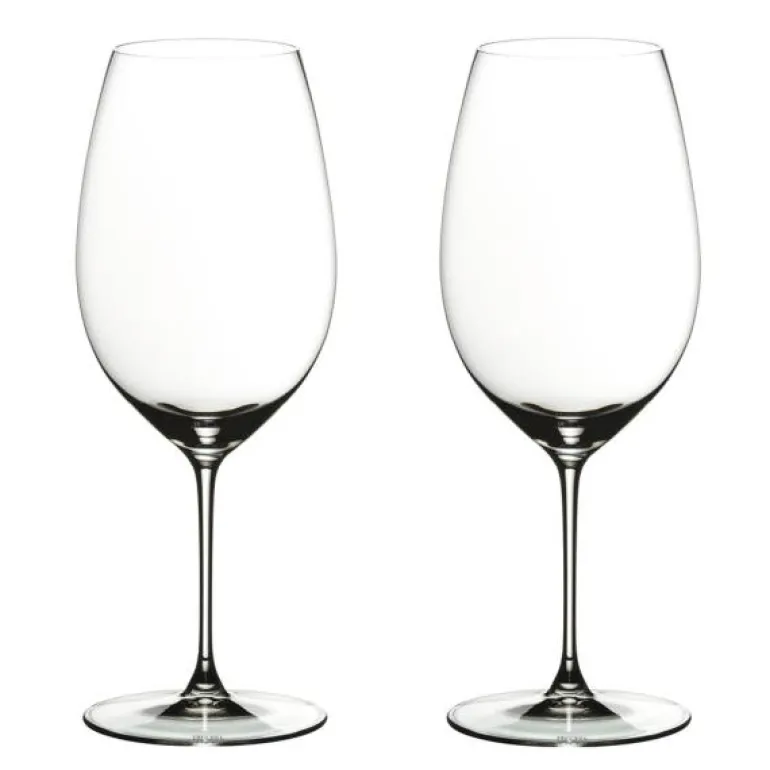 To stykk druespesifikke vinglass for shiraz fra den nye verden fra Riedel Veritas. Det som skiller dette vinglasset fra cabernet/merlot-glasset, er at klokken er høyere og har mindre åpning. Formen på klokken forsterker duften og den sjenerøse smaken, som gir vinen en perfekt balanse mellom frukt, styre og bitterhet.